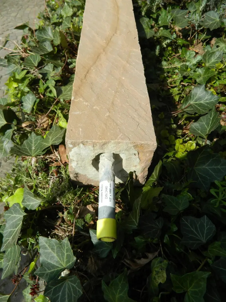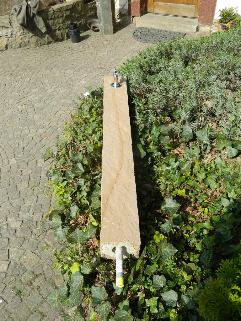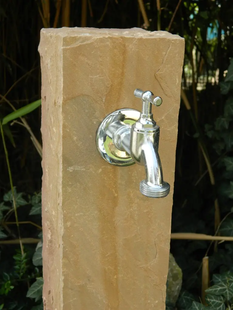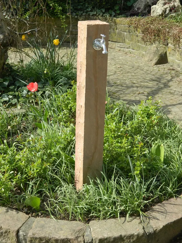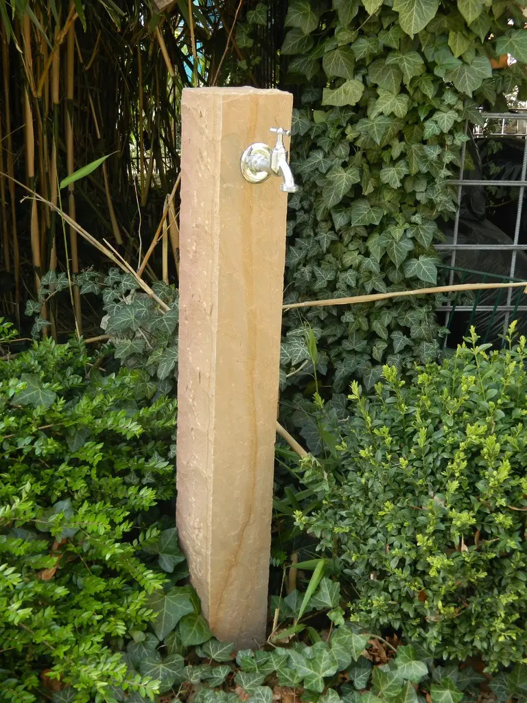 Wasserzapfsäule aus beige-braunem Sandstein.